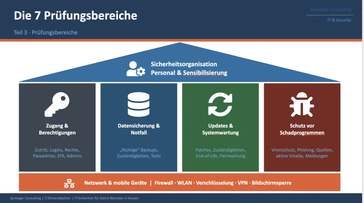 Der IT-Sicherheits-Check ist der schnellste Weg, um zuverlässig herauszufinden, ob Ihr Betrieb sicherheitsrelevante Lücken aufweist. Thomas Sprenger prüft Ihren Betrieb systematisch in 7 Bereichen. Verständlich, unabhängig, ohne Fachchinesisch. Am Ende wissen Sie genau, wo Sie stehen.