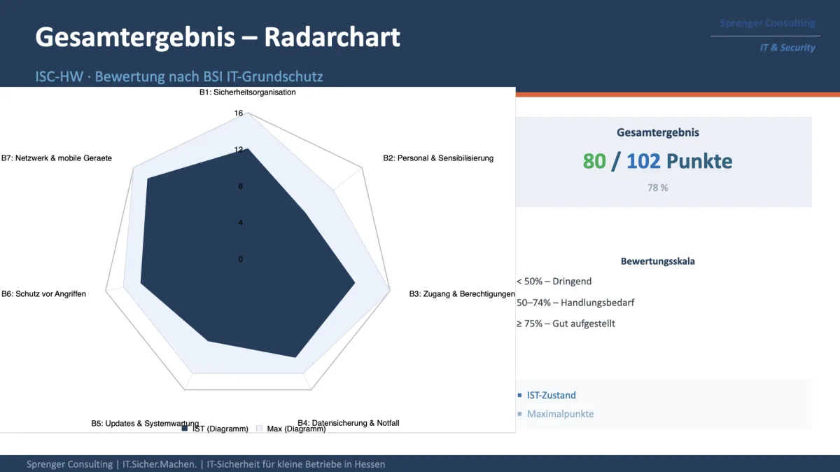 Mein „IT-Sicherheits-Check“ basiert direkt auf dem bewährten BSI IT-Grundschutz – und wächst mit Ihrem Betrieb: vom ersten Check bis zur ISO 27001-Zertifizierung. Vergleichbare Angebote wie der BSI CyberRisiko-Check bieten diesen Wachstumspfad nicht.