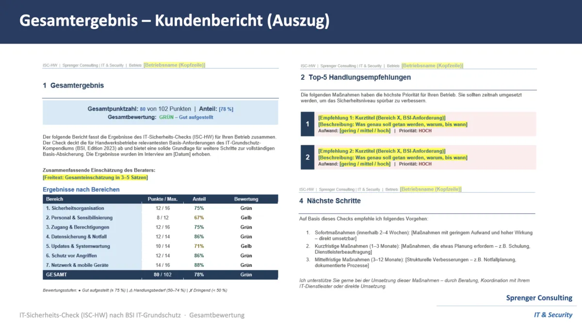 Auf Basis des Befunds entscheiden Sie selbst, welche Schritte Sie gehen wollen. Thomas gibt Ihnen die TOP 3 Maßnahmen mit der größten Wirkung. ohne Verkaufsdruck, ohne Folgeverpflichtung. Hauptsache ihr Betrieb ist sicher.